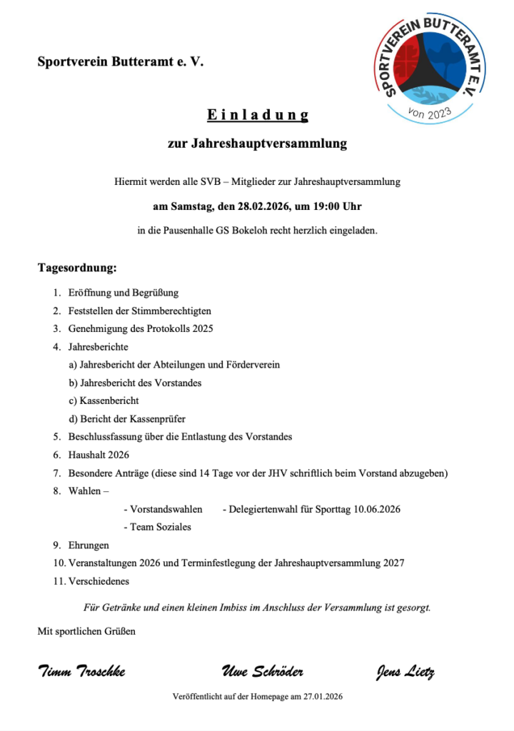 Der Sportverein Butteramt lädt alle Mitglieder zur Jahreshauptversammlung ei